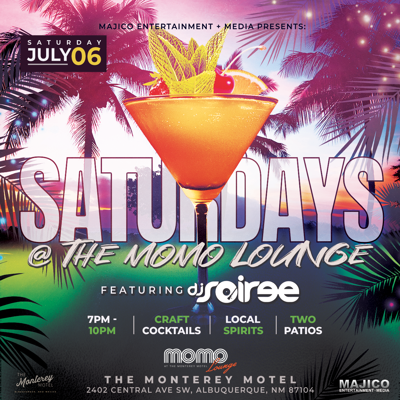 The Momo Lounge 2402 Central Ave SW, Albuquerque, New Mexico, United StatesJoin us every Saturday from 7pm-10pm at The Momo Lounge for an unforgettable evening of music and craft cocktails. This Saturday, July 6th, enjoy beats by DJ Soiree while sipping on small-batch craft spirits and cocktails from local distilleries, including Monterey Motel’s own gin and vodka. Our bartenders are masters of mixology, ready to serve...
